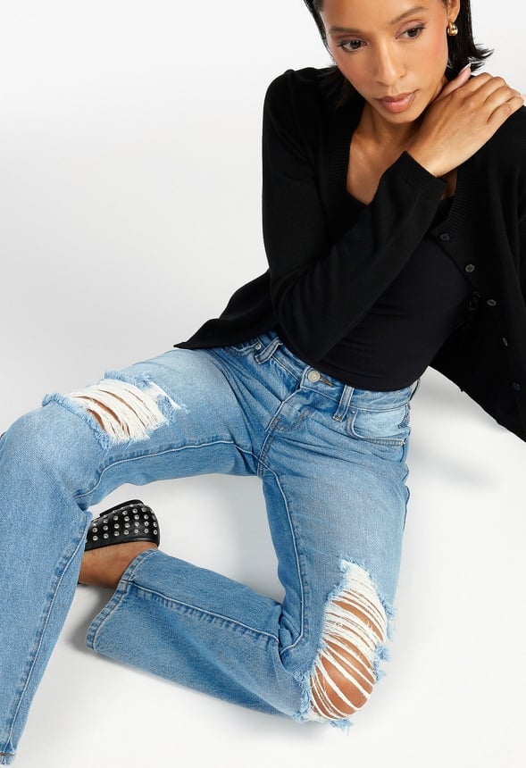 Front distressing knee detail Material : 100% Cotton Fit : Non-Stretch Denim Approx. Front Rise : 11.75 Approx. Leg Opening : 15.75 Approx. Inseam : 31.5 Fabrication : Medium Destroy Wash Closure : 5-pocket zipper button front closure Care : Machine wash. Please refer to care instruction label inside garment for further details. Imported