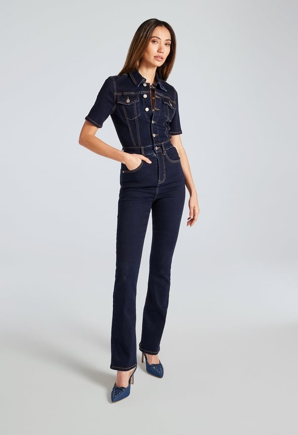 Material : 71% Cotton, 26% Polyester, 3% Spandex Approx. Front Rise : 13.75 Approx. Inseam : 31.5 Approx. Leg Opening : 16.5 Fabrication : Dark Wash Care : Machine wash cold. Imported