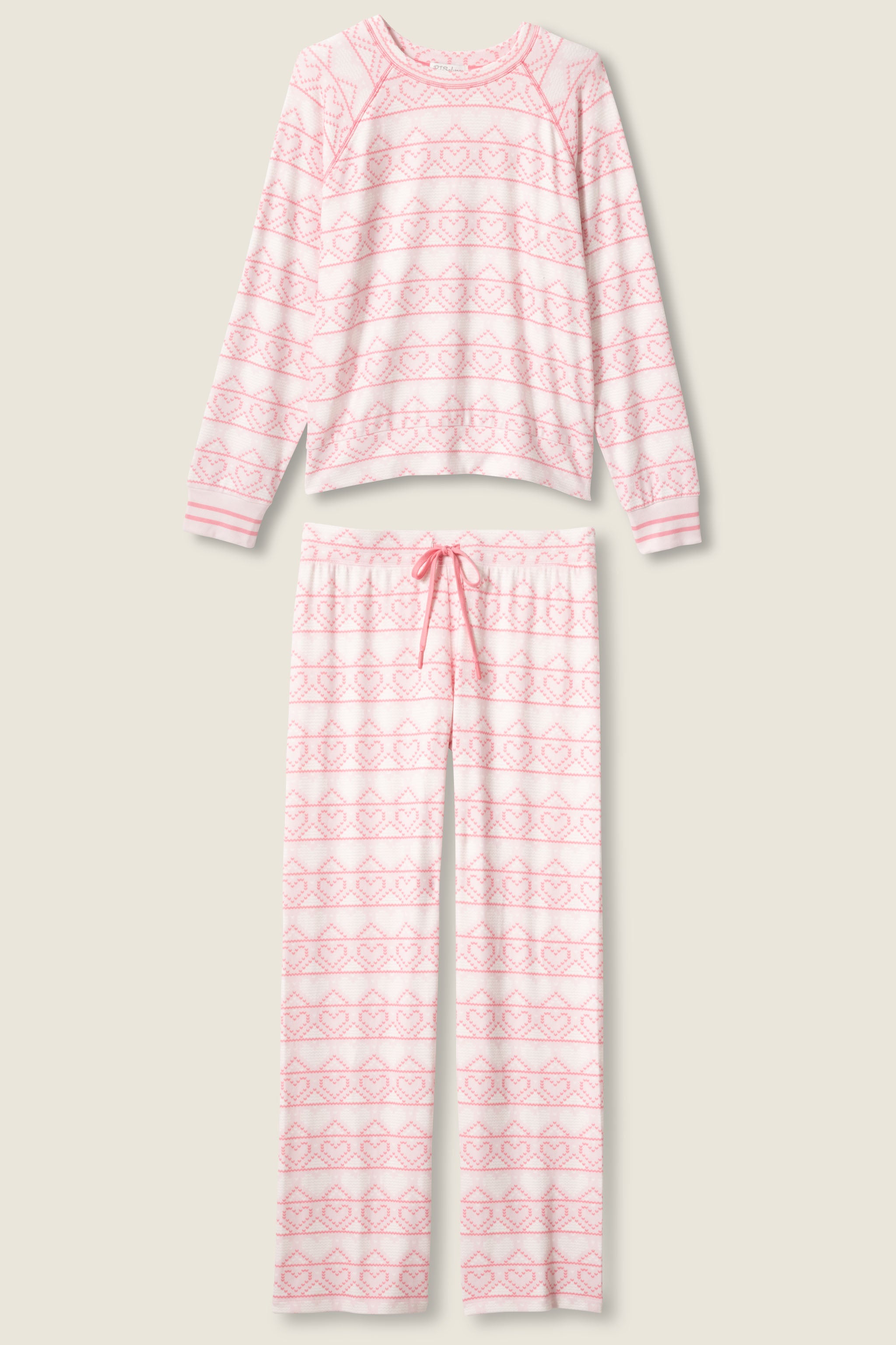 This soft peachy jersey pajama set brings a cozy twist to classic Fair Isle with rows of pink hearts. The relaxed long-sleeve top and matching pants make every night feel like a cozy celebration of self-love. Perfect for movie marathons. slow mornings. and any excuse to stay in.