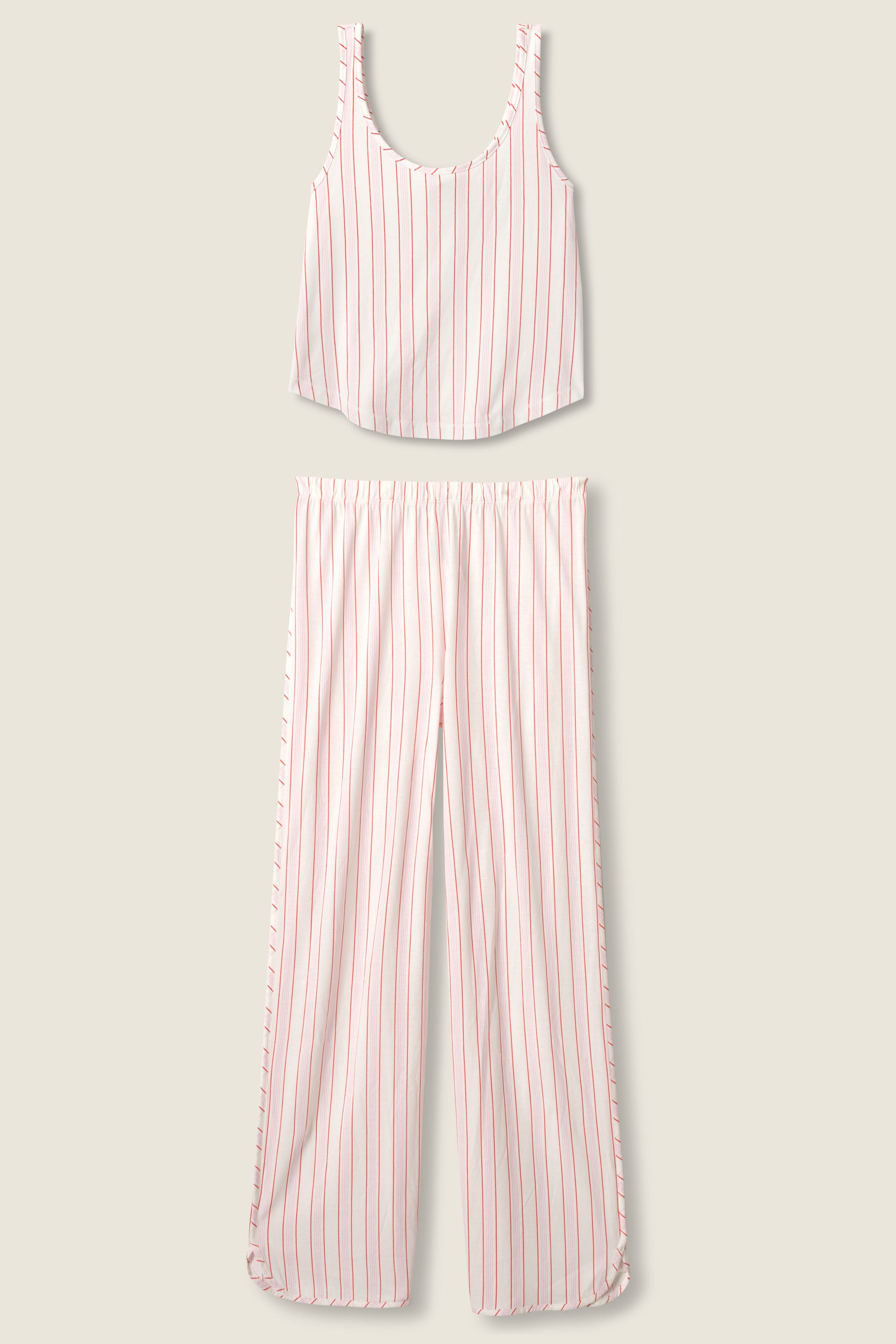 Ivory. red. and pink stripes bring a playful twist to this striped two-piece pajama set. Crafted in soft cotton-modal jersey. it includes a scoop-neck tank and matching open-leg pants for a look that’s as comfy as it is classic.