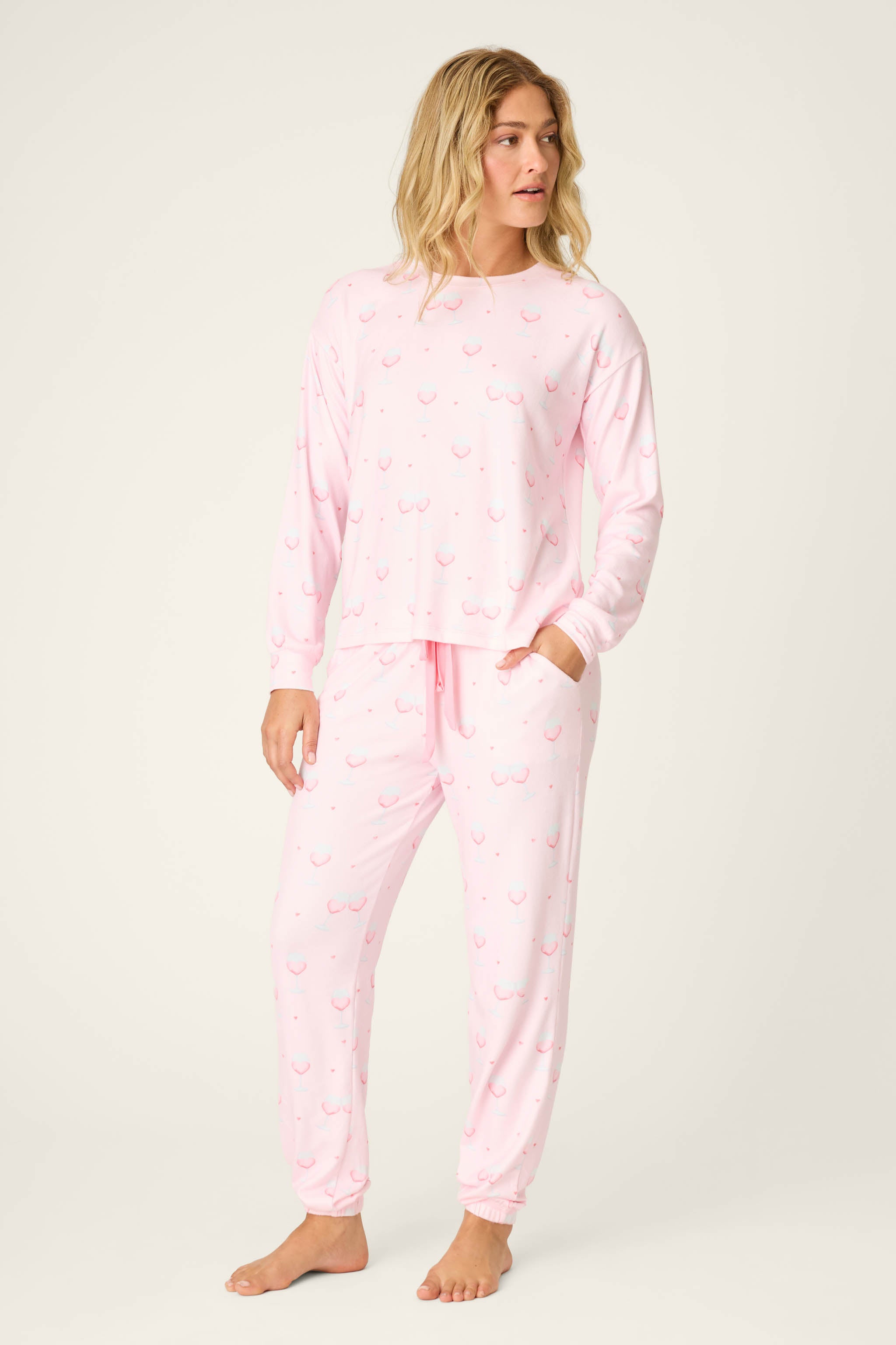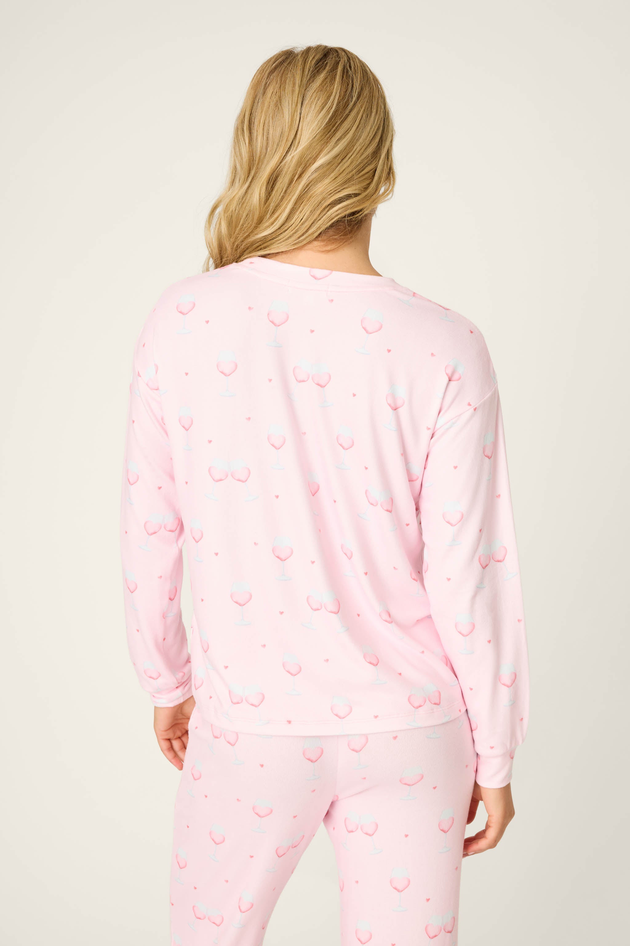 Playful and pretty in light pink. this long-sleeve top toasts to love. comfort. and cozy nights in. Crafted in ultra-soft butter jersey. it’s patterned with heart-shaped wine glasses and finished with a relaxed crew neckline—perfect for lounging. unwinding. or sipping something sweet.