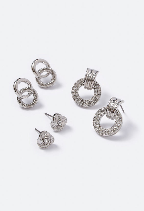 3 pair stud set featuring glass rhinestone linked rings and mini door knocker studs. Material : 80% Zinc, 15% Iron, 5% Glass Closure : Bullet and Rubber Stoppers Dimensions : Width: 0.46 to 0.65 , Length: 0.37 to 0.86 Imported