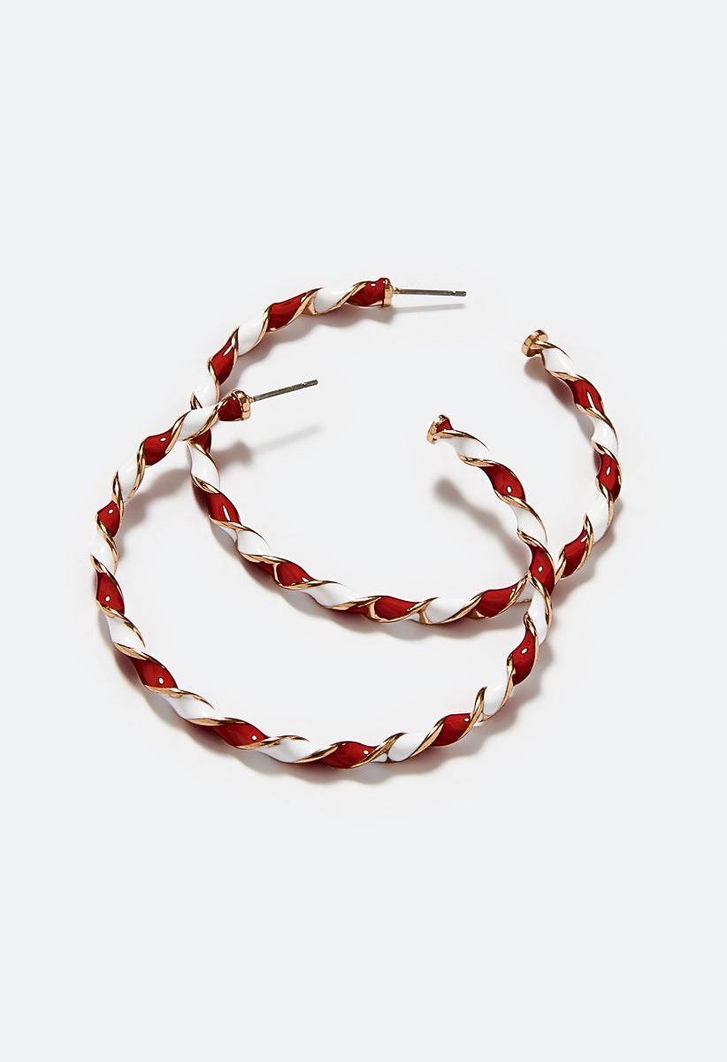 Joy Candy Cane Enamel Hoop Earrings Add Fun For Holiday Season And Gifting Material : 60%zinc 30%epoxy 10%iron Dimensions : Diameter:1.5 Closure : Bullet & Rubber Stoppers Imported