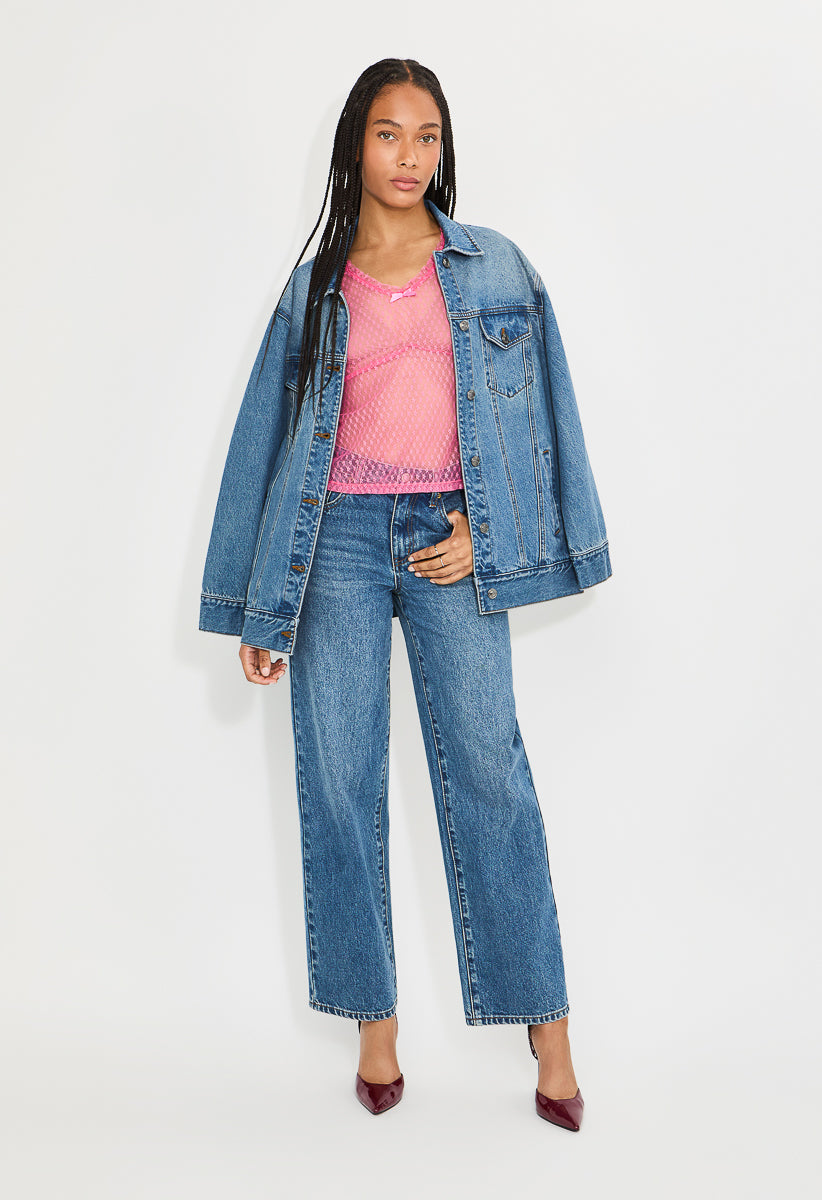 Sheer lace Bow front Ruffle trim Material : 95% Nylon, 5% Elastane Length : 20 1/2 Care : Machine wash. Please refer to care instruction label inside garment for further details. Imported