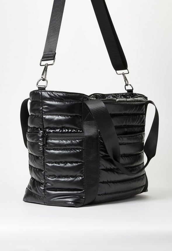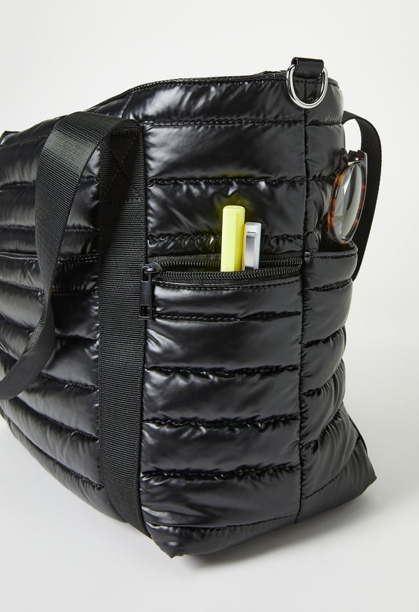Material : Nylon Dimensions : 14.17 L (Top: 18.9 ) x 6.69 W x 11.02 H Strap : 23.62 Drop : 7.87 Pockets : 1 interior pocket, 1 interior zip, 1 exterior pocket, 1 exterior zip Hardware : Silver Closure : Zipper Imported