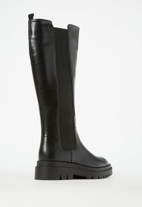 A flat boot with a lug sole and zip closure. Material : Faux-Leather Platform Height : 1.75 Outside Heel Height : 2 Shaft Height : 14.75 Imported