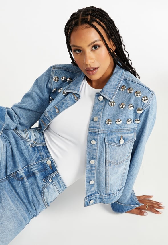 Metallic stud detail Chest pockets with button closure Boxy fit Sleeve button closure Material : 100% Cotton Fabrication : Light Wash Length : 21.0 Closure : Button front closure Care : Machine wash. Please refer to care instruction label inside garment for further details. Imported